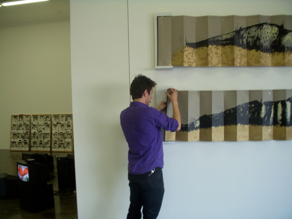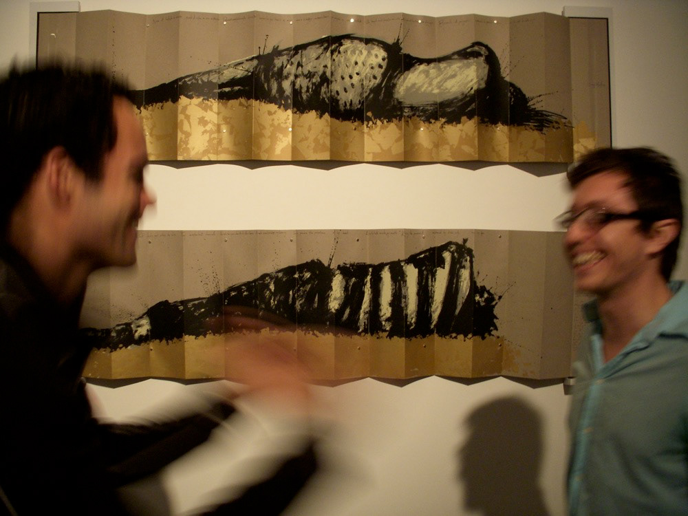 The book is 7 (seven) feet long, and I fit in it like a coffin. It is printed on a single sheet of paper in a 5-layered silkscreen. The accordion folds, deconstructs, and fragments the large image of a male on one side, and a female on the other. The golden ground re-contextualizes these bodies, elevating them to quasi-religious iconography; breaking for an instant the ultra-violent death, so that these beings can indulge in a peaceful, golden sleep.